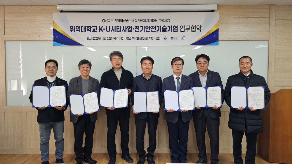 위덕대학교(총장 구동현) RISE사업단 K-U시티사업팀이 지난 11월 20일 한국전기기술인협회 경북동도회(회장 김경환)와 경주지역 전기안전관리기술기업 5개사와 함께 지역 산업 발전과 전문 인재 양성을 위한 산학교류 업무협약(MOU)을 체결하였다.