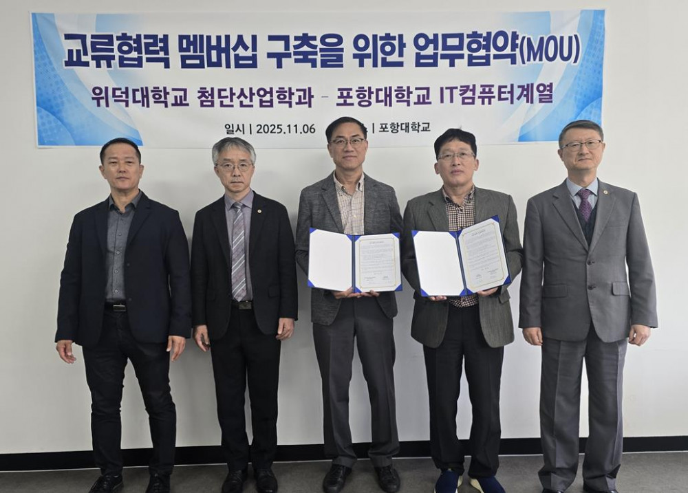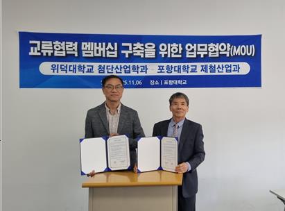 위덕대학교(총장 구동현) 라이프UP융합대학 첨단산업학과가 지난 11월 6일, 포항대학교 제철산업과 및 IT컴퓨터계열과 지역의 평생직업교육체제 구축과 평생직업교육 공동과제 발굴, 교류 확대 및 증진을 위해 상호협력 업무협약(MOU)을 체결하였다.
