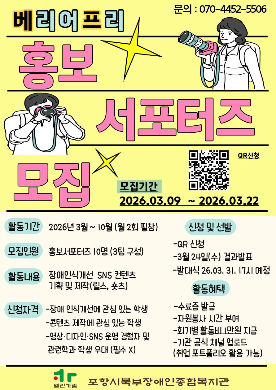 베리어프리 홍보 서포터즈 모집 페이지 정보 작성자 학자금담당자 댓글 0건 조회 29회 작성일 26-03-10 09:19 목록 본문 붙임 파일을 참조하여 주시기 바랍니다 다음글장애가정아동 성장멘토링 멘토모집 26.03.10