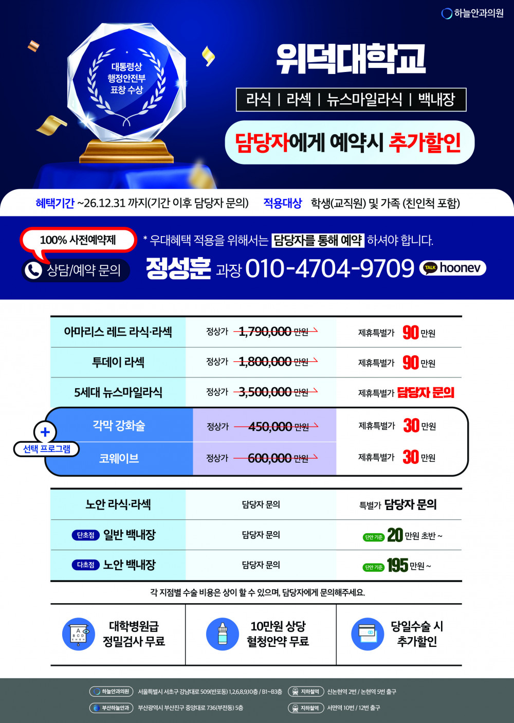 위덕대학교 ✖ 하늘안과 제휴 특별할인 안내 페이지 정보 작성자 학자금담당자 댓글 0건 조회 232회 작성일 26-02-05 09:27 목록 본문 1. 대상 : 학생 및 가족(친인척 포함)2. 기간 : 제휴종료시 까지3. 상담/예약 : 정성훈과장 010-4704-9709 (사전예약필수)4. 온라인 신청 : http://m.bweye.co.kr/event205/?ref=ud신청페이지 내 제휴가 금액에서 추가할인 진행 이전글[학교법인 회당학원] 제532회 정기이사회 개최 26.02.06 다음글학칙 개정(안) 공고 26.01.23