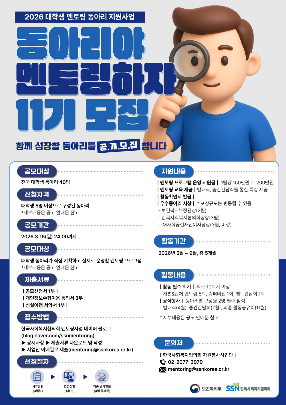 한국대학사회복지협의회에서 대학생의 멘토링 활동을 장려하기 위해 운영하는 2026년 대학생 멘토링 동아리 지원사업 공모를 다음과 같이 진행하오니, 관심 있는 동아리에서는 공모 기한 내에 신청 서류를 제출하시기 바랍니다.